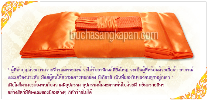 แล้วจึงนำไปซื้อผ้าแพรมาทำเป็นผ้าสบง จีวรสังฆาฏิบาตรครบเครื่องอัฎฐะแล้วจึงนำเข้าไปถวายแก่