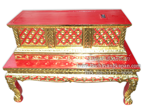 โต๊ะมาลัยและตู้พระธรรม ใช้ในงานสวดพระอภิธรรม บรรจุหนังสือพระมาลัย เหมาะสำหรับใช้ในวัดหรือศาสนสถานอื่นๆ ทำจากไม้เบญจพรรณ แกะลายปิดทอง(ทองK)ทาสีแดง ร่องชาติ ทั้งชุดประกอบด้วยตัวตู้ขนาดกว้าง28ซม. ยาว 68 ซม.สูง22 ซม. พร้อมฝาปิด จำนวน 1 ใบ และตั่งรองขนาด กว้าง 51 ซม. ยาว 76 ซม.สูง 35 ซม.จำนวน 1 ตัว
